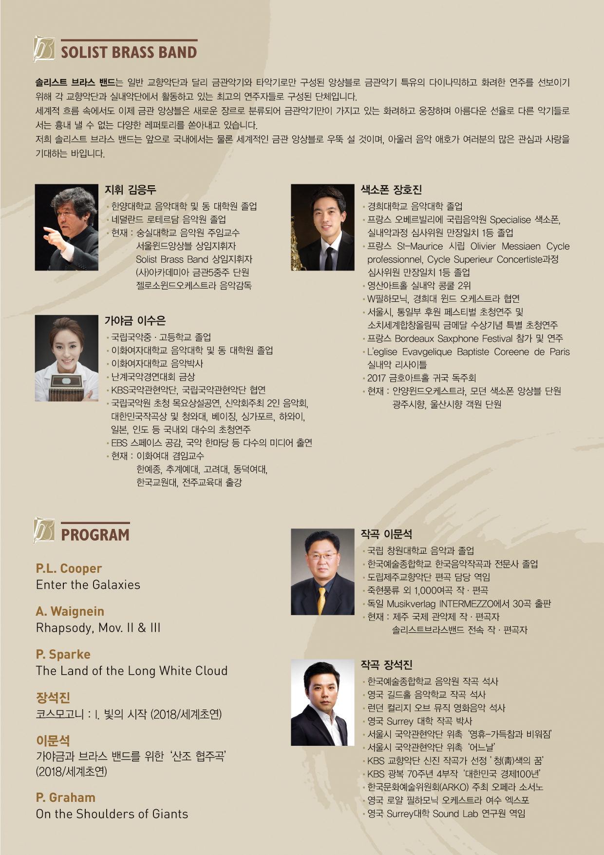 솔리스트 브라스 밴드는 일반 교향악단과 달리 금관악기와 타악기로만 구성된 앙상블로 금관악기 특유의 다이나믹하고 화려한 연주를 선보이기 위해 각 교향악단과 실내악단에서 활동하고 있는 최고의 연주자들로 구성된 단체입니다.