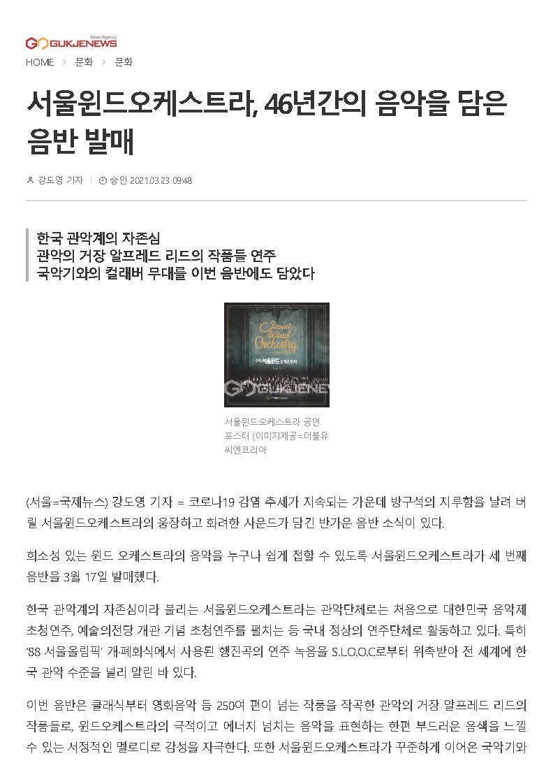 (서울=국제뉴스) 강도영 기자 = 코로나19 감염 추세가 지속되는 가운데 방구석의 지루함을 날려 버릴 서울윈드오케스트라의 웅장하고 화려한 사운드가 담긴 반가운 음반 소식이 있다.희소성 있